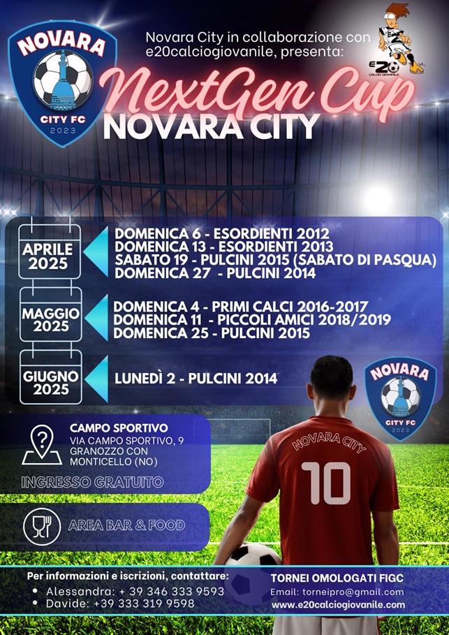 La società NOVARA CITY F.C. in collaborazione con la E20 CALCIO GIOVANILE organizza i seguenti tornei di calcio giovanile per le categorie ESORDIENTI – PULCINI – PRIMI